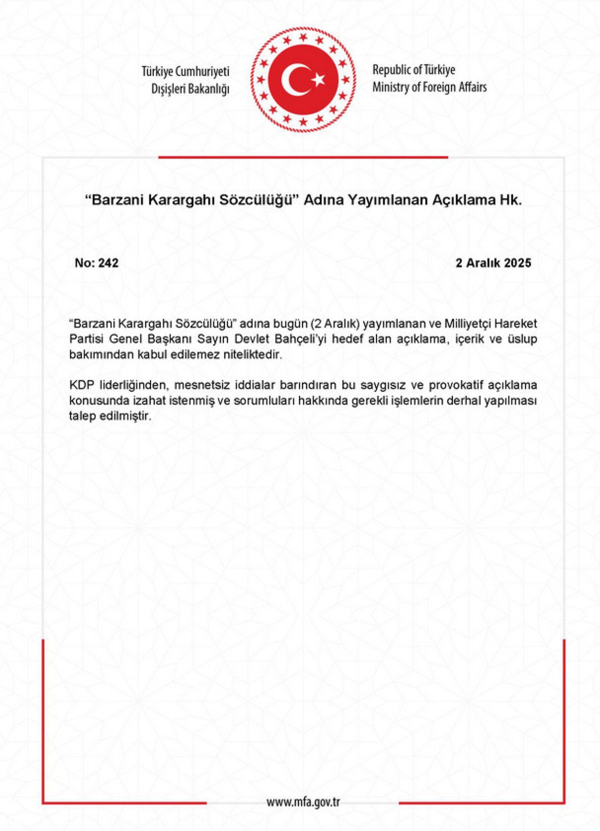 Dışişleri’nden yapılan açıklamada, “‘Barzani Karargahı Sözcülüğü’ adına bugün yayımlanan ve Milliyetçi Hareket Partisi Genel Başkanı Sayın Devlet Bahçeli’yi hedef alan açıklama, içerik ve üslup bakımından kabul edilemez niteliktedir” denildi.