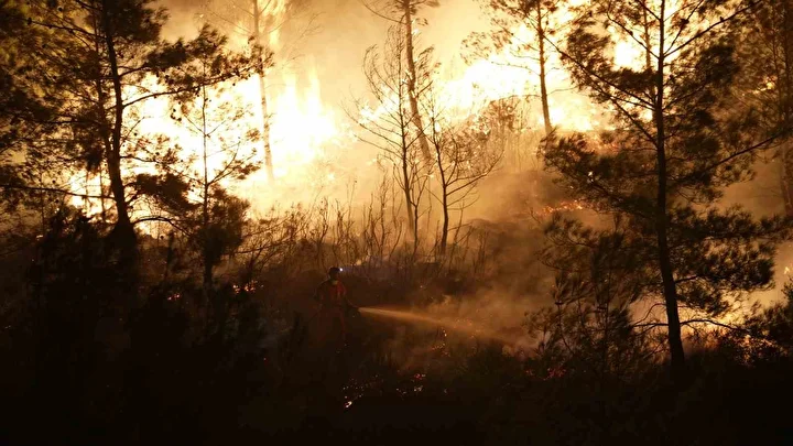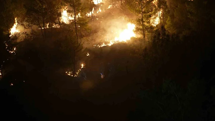 Yangın söndürme ekipleri karadan alevlerin kontrol altına alınması için yoğun çaba sarf ediyor. Gecenin karanlığında alevlerin içindeki cansiperane mücadele ile yangının kontrol alınması için çaba sarf ediliyor.